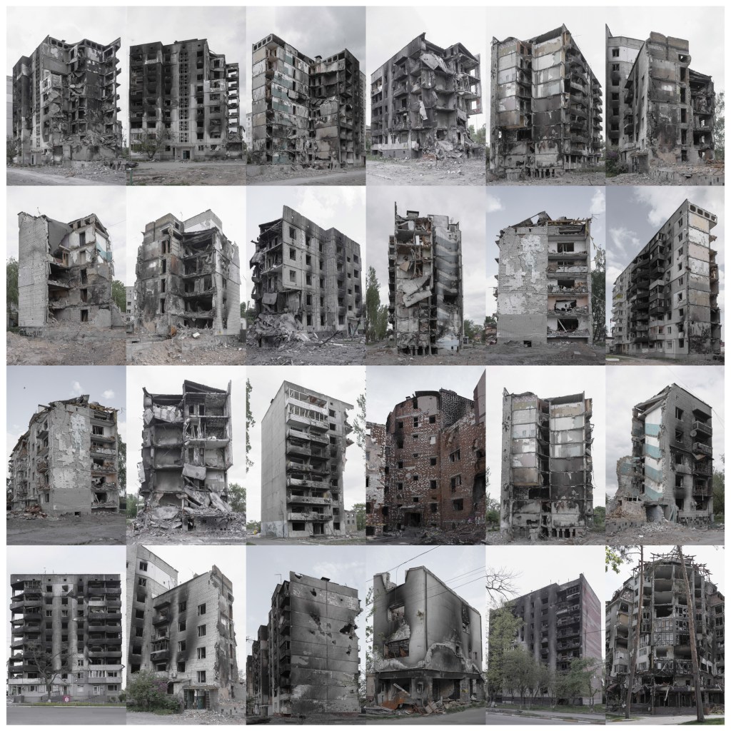 Afbeeldingen. 1,2 en drie: foto’s van Babyn Yar uit november 1941, gemaakt door de Duitse militaire fotograaf Johannes Hähle. (Hamburger Institut für Sozialforschung); 4 en 5: Oekraïense militairen en door Russisch vuur kapotgeschoten gebouwen. Foto’s van Antoine d’Agata uit ‘Un endroit inconvénient’; 6: Straatbeeld in Kyiv onder Duits bewind. Ook een foto van Johannes Hähle.