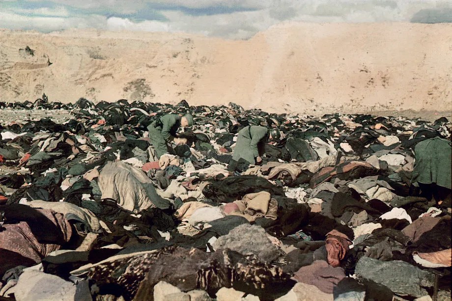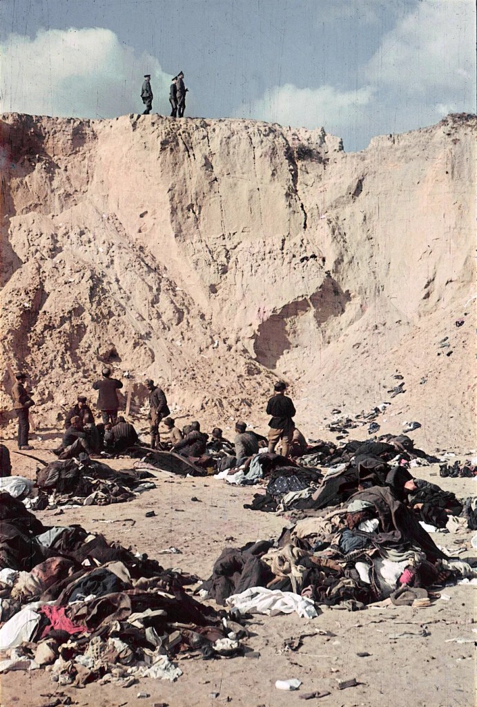 Geen enkele twijfel bestaat er echter aan de echtheid van de foto’s van Johannes Hähle, fotograaf van de Duitse ‘Propagandakompanie nr. 637′. Toen hij in november 1941 aankwam bij het ravijn Babyn Yar in een buitenwijk van Kyiv had de vermoedelijk omvangrijkste massa-executie uit de menselijke geschiedenis daar al plaatsgevonden: op 29 en 30 oktober zijn er 33.771 mensen doodgeschoten – Joodse mannen, vrouwen en kinderen. Toch geven de foto’s van Hähle een indruk van de enormiteit van het gebeuren, al kiekt hij niet de gruweldaad zelf, maar de nasleep ervan: het doorzoeken van de kleding der gevallenen op kostbaarheden, de dwangarbeiders die de ongekende stapel lijken met aarde moeten bedekken. (Tekst gaat door onder de afbeeldingen).