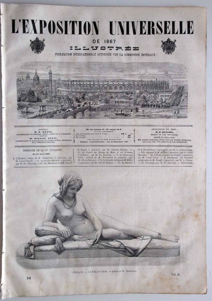 Afbeeldingen: 1. Het Champ de Mars met het Expositiepaleis in 1867. Litho, ‘Histoires de Paris’; 2. Centrale ruimte Expositie-paleis, Foto van Pierre Lanith Petit (1831-1909), (Musée d’Orsay); 3. Oostenrijkse inzending in 1867. Foto van Louis Auguste Bisson (1814-1876) (BnF); 4. Édouard Manet (1832-1883): Vue de l’exposition universelle de Paris 1867. (1867, National Museum of art, architecture and design, Oslo); 5. Verkooptentoonstelling van Gustave Courbet, 1867; 6,7 en 8: Exemplaren van de eigen krant van de Exposition universelle (BnF); 9: Charles Porion (1814?-1905?): Napoléon III et les souverains étrangers invités à l’Exposition universelle de 1867. In 1867 in opdracht gegeven, maar datum van voltooing niet geheel duidelijk. Op de eerste rij v.l.n.r. koning Karel XV van Zweden, koning Wilhelm I van Pruissen, keizer Franz-Joseph van Oostenrijk, Napoleon III, tsaar Aleksandr II, koning Leopold II van België. Op de tweede rij onder andere de Nederlandse kroonprins Willem van Oranje (1840-1879) en de Pruissische kanselier Otto von Bismarck, respectievelijk tweede en derde van links. (Musée du Second Empire, Château de Compiègne).