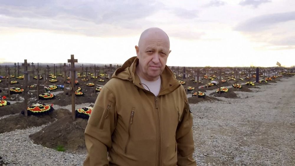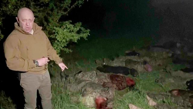 Afbeeldingen: 1. Prigozjin voor een begraafplaats van gesneuvelde Wagner-strijders in 2023; 2. Prigozjin bedient eigenhandig president Poetin; 3. Vlak voor de executie met een moker van Jevgeni Noezjin; 4. Prigozjin houdt videotoespraak in weiland met gesneuvelde Wagner-soldaten, 2023.