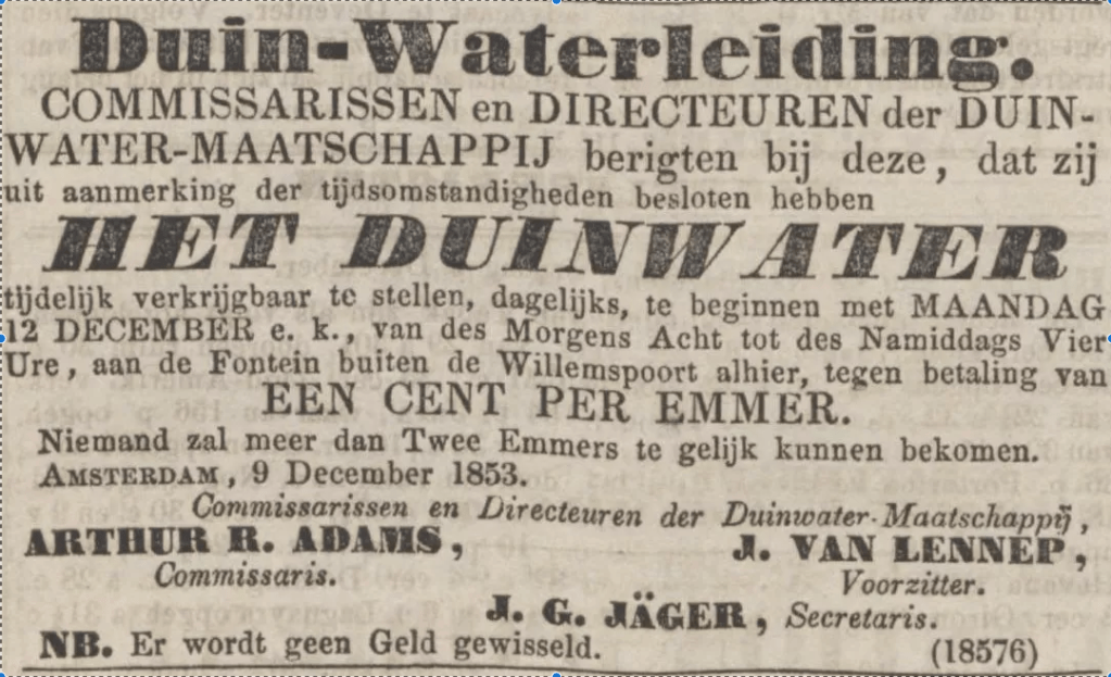 Afbeeldingen: 1. De Nieuwezijdsvoorburgwal, ca. 1910. Foto van Bernard F. Eilers (1878-1951) (Stadsarchief); 2. Amsterdam, Oranje-Vrijstaatkade, in de Oostergasfabriek. (Fotograaf onbekend, 1890, Stadsarchief); 3. In opdracht van het Amsterdamse gemeentebestuur stelt de (Britse) Duinwaterleiding-maatschappij gezond water ter beschikking aan degenen die niet op hun waternet zijn aangesloten. Aanleiding is de cholera-epidemie van 1853, de derde van vier die Nederland in de negentiende eeuw troffen. (Delpher)