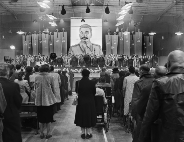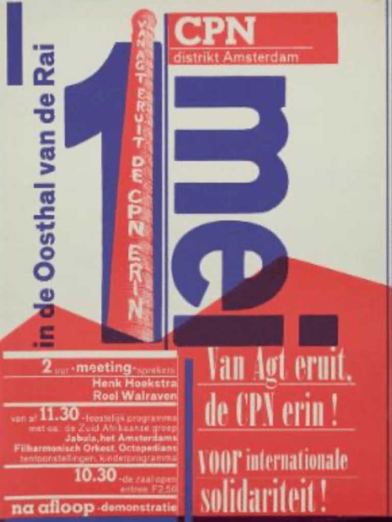 Afbeeldingen: 1. Herdenking bij het overlijden van Stalin in de Amsterdamse Apollo-hal, 10 maart 1953 (Dolf Kruger, Nederlands Fotomuseum); 2. Paul de Groot spreekt CPN-congres toe in 1950. (Foto ANEFO [Hartog] / Nationaal Archief); 3. Verkiezingsaffiche 1977. (Geheugen van Nederland).