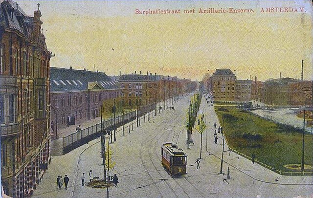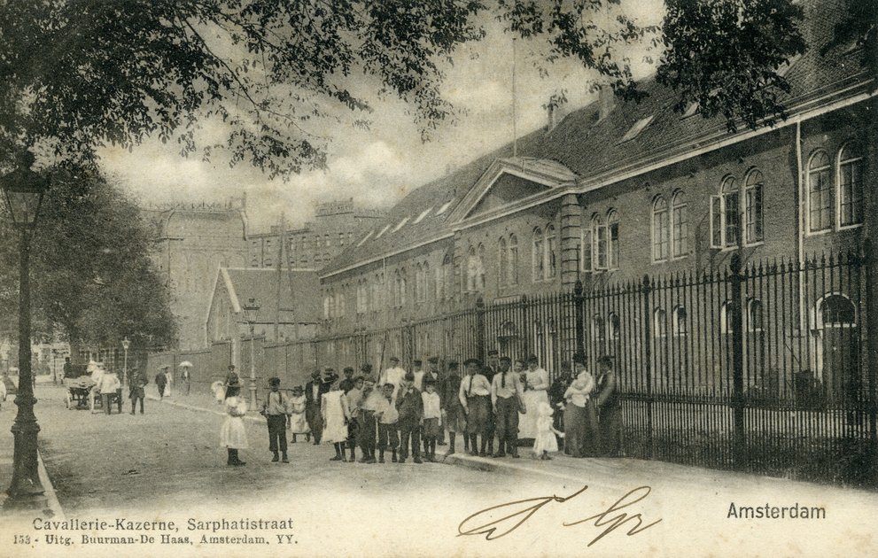Afbeeldingen: 1. Ingekleurde prentbriefkaart van de Sarphatistraat met de Cavallerie-kazerne, gezien in westelijke richting. (Wikimedia); 2. Cavallerie-kazerne in de Sarphatistraat-straat te Amsterdam, gebouwd o.l.v. genie-officier P.J. de Waal. (collectie Nederlands Militair Museum). (Beide foto’s vermoedelijk rond 1900-1910)