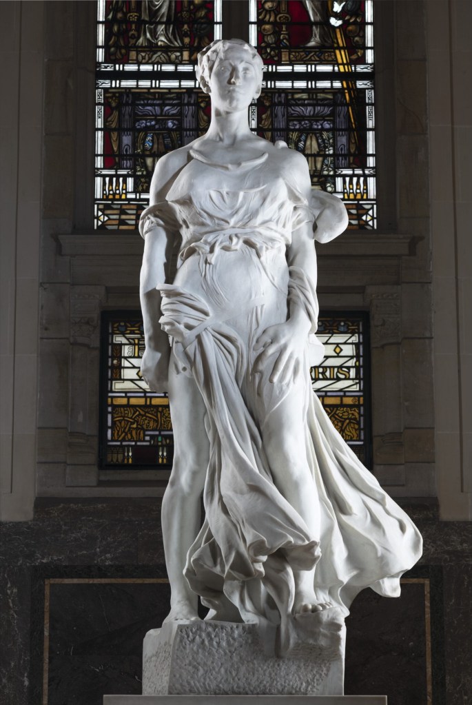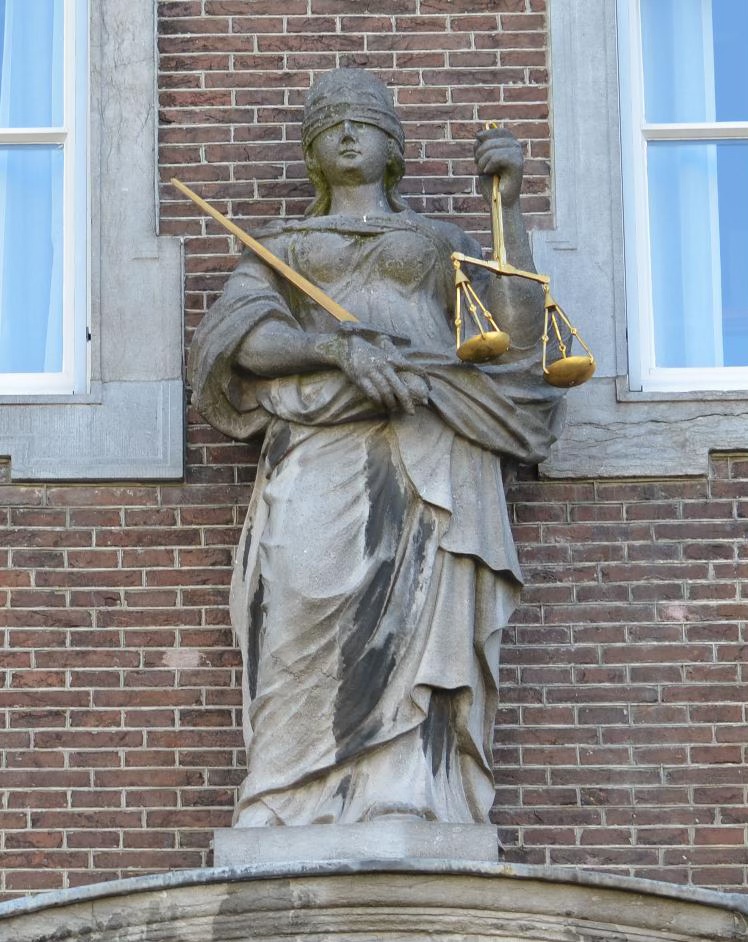 Afbeeldingen: 1. Vrouwe Justitia bij het oude stadhuis van Breda. Het beeld van Wouter Pompe (1703-1777) dateert uit 1767; 2. Het beeld ‘Vrede en recht’ in het Vredespaleis in Den Haag, een vrouwe Justitia zonder de gebruikelijke attributen. Het werk uit 1924 is van de Amerikaanse beeldhouwer Andrew O’Connor (1874-1941).