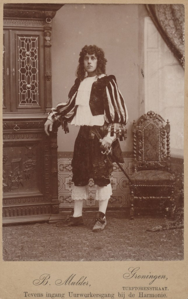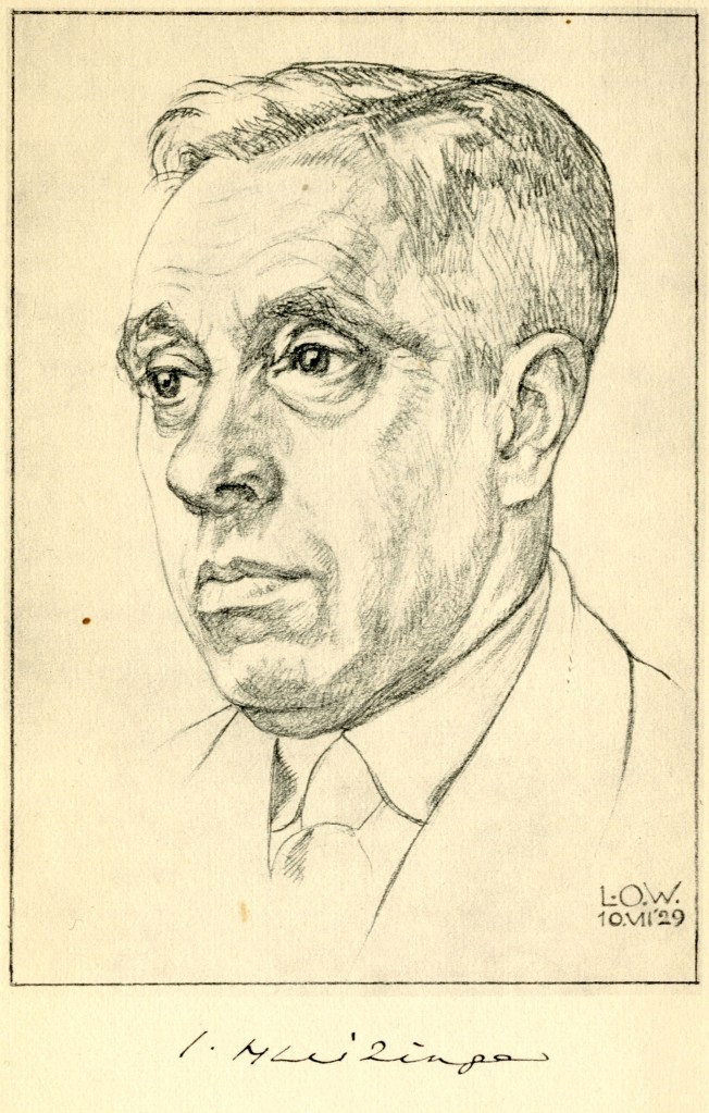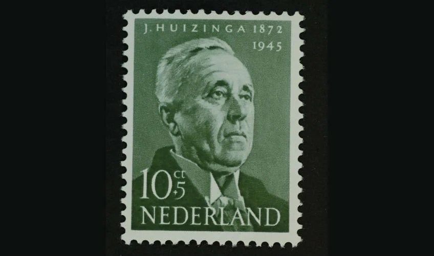 Afbeeldingen: 1. In 1954 uitgegeven postzegel met de beeltenis van Johan Huizinga. (Nationaal archief); 2. Huizinga als deelnemer aan een studentenmaskerade in Groningen, 1894 (Literatuurmuseum); 3. Portret van Huizinga uit 1929, door Oswald Wenckebach (1895-1962, collectie Laura Conley-Huizinga, New York).