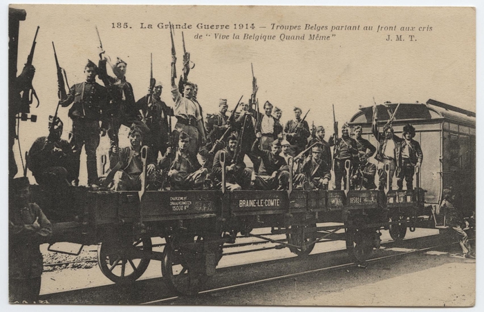 Afbeelding: Belgische troepen op weg naar het front in 1914. Prentbriefkaart, Erfgoed Land van Rode).